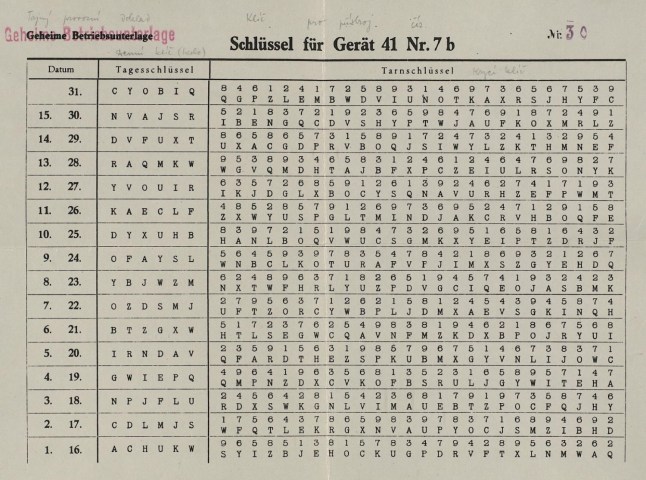 The archive also contained a field manual for operators,a regulation known as Vorschrift Nr. 90 explaining how encryption keys were generated,and monthly key tables used between 16 and 31 March,1945.
