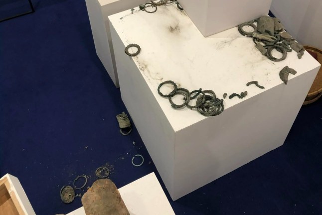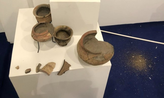 Photographs showed shattered pottery scattered on the museum floor,with some display pedestals nearly empty.