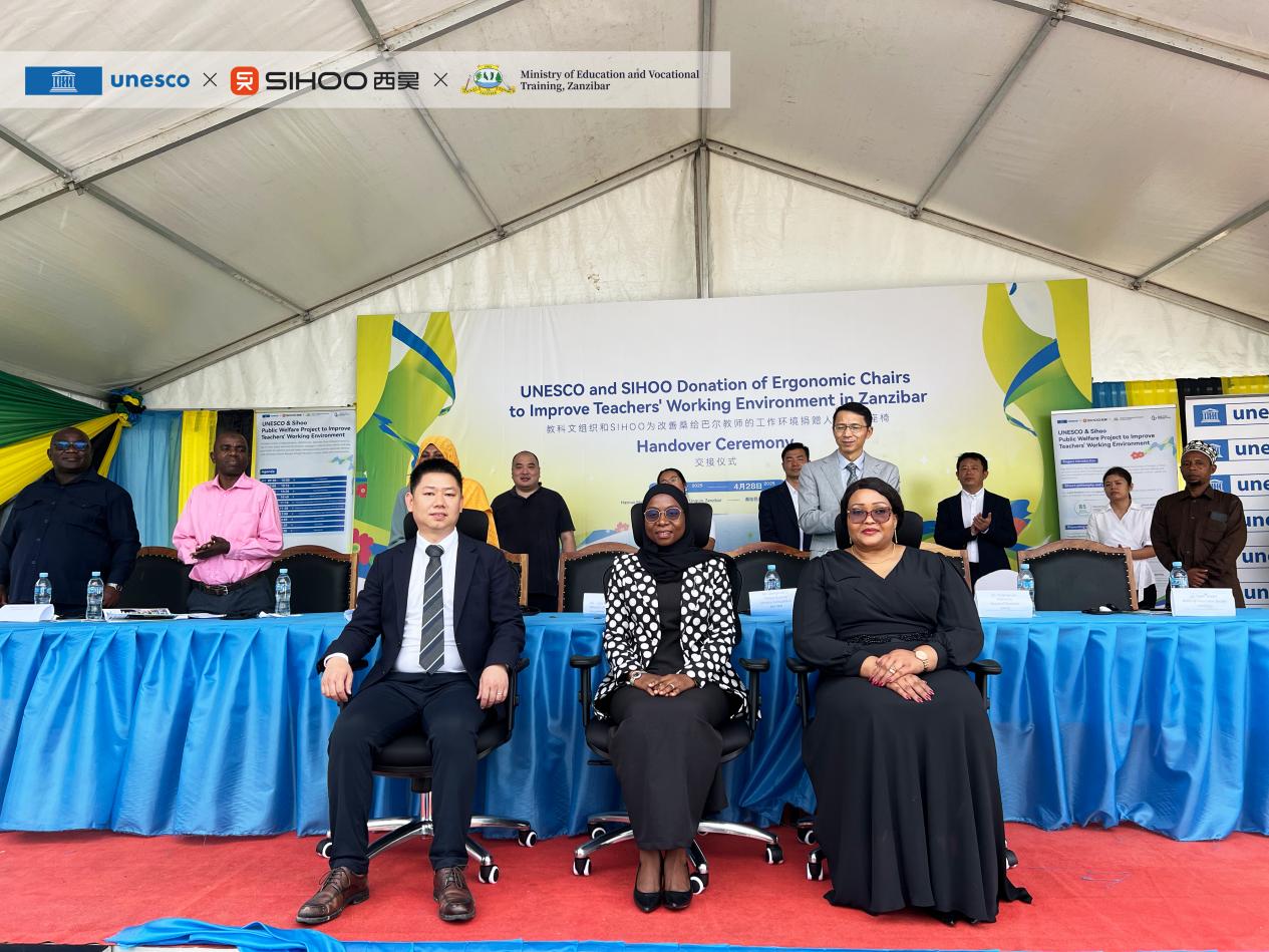 On April 28, 2025, the Handover Ceremony for the Donation of Ergonomic Chairs to Improve Teachers' Working Environment in Tanzania was grandly held in Zanzibar, under the joint initiative of United Nations Educational, Scientific and Cultural Organization (UNESCO) and Shenzhen Sihoo Intelligent Furniture Co., Ltd. (Sihoo). On the occasion of the 61st anniversary of the establishment of diplomatic relations between China and Tanzania, this event was carried out with the theme of "Decent Work and Economic Growth" among the United Nations (UN) Sustainable Development Goals (SDGs). At the ceremony, hundreds of sets of ergonomic chairs and related supplies worth over USD 100,000 were donated to teachers in the Mainland and Zanzibar, Tanzania, in an effort to alleviate the local structural shortage crisis among teachers through a better the working environment of basic education workers and to promote educational equity and regional sustainability. The ceremony was attended by the representative of UNESCO in Tanzania, leaders of relevant government agencies in Zanzibar, Li Qianghua, Consul General of the Chinese Consulate General in Zanzibar, Luo Huiping, Chairman of Sihoo, and Chen Zhuo, Sihoo's General Manager for the Asia-Pacific, Africa, and Latin America regions, among others.