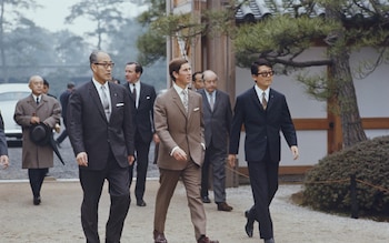 Charles being escorted by guides and dignitaries as he visits Nijo Castle in Kyoto during his 1970 trip to Japan
