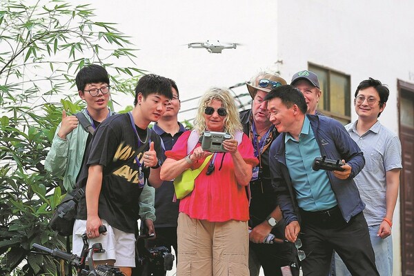 Photographers and designers gather around Joerdis Montgomery,a filmmaker from Berlin,Germany,as she operates a drone to capture aerial shots of a village in Libo county,Guizhou province,on Sept 12,2024,during a five-day trip of 31 visual artists in Guizhou. KUANG LINHUA/CHINA DAILY