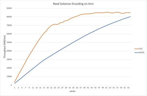 Specifically,MinIO was able to enhance its existing implementation of its Reed Solomon erasure coding library. The result was 2x faster throughput as compared to the previous NEON instruction set implementation,as is shown in this graph: