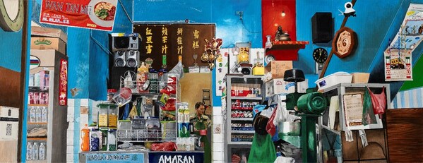 Crafted using diptych,"A Sip Through Time" captures a coffee shop frozen in time,boasting an eclectic mix of objects,posters,clocks,traditional sweets and other items commonly seen in traditional coffee shops. The inclusion of a QR code and surveillance camera merges the traditional and digital worlds,hinting at progressiveness. Through the artwork,the artist hopes to convey positive emotions of days past,transporting viewers back in time to simpler and slower moments.