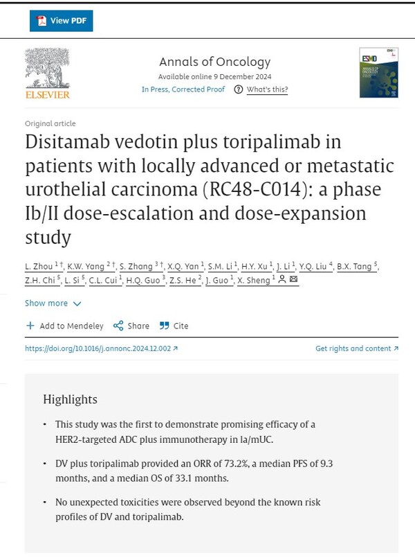 YANTAI,China,Jan. 8,2025 --On Janurary 7th,2025,Annals of Oncology (IF: 56.7),a top oncology journal globally,published remarkable long-term follow-up results of a phase 1b/2 clinical trial on Disitamab Vedotin (DV)(developed by Remegen Co.,Ltd) combined with Toripalimab in treating locally advanced or metastatic urothelial carcinoma (la/mUC) (NCT04264936,study ID: RC48-C014). This trial was supervised by Professor Jun Guo and Professor Xi'nan Sheng's teams from Peking University Cancer Hospital.