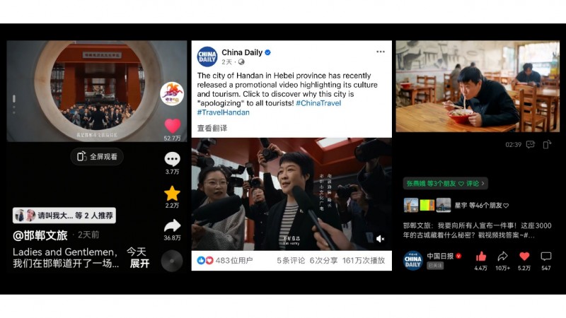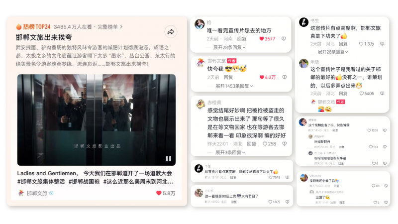 Reportedly, after being shared on China Daily’s Facebook page, the video surpassed 400,000 views within 24 hours. On China Daily’s WeChat video channel, it received over 100,000 interactions and more than 2 million views. On Douyin, the trending topic #HandanTourismComeOutAndAcceptCompliments# had over 40 million online views. As of this article’s release, Douyin interactions exceeded 900,000.