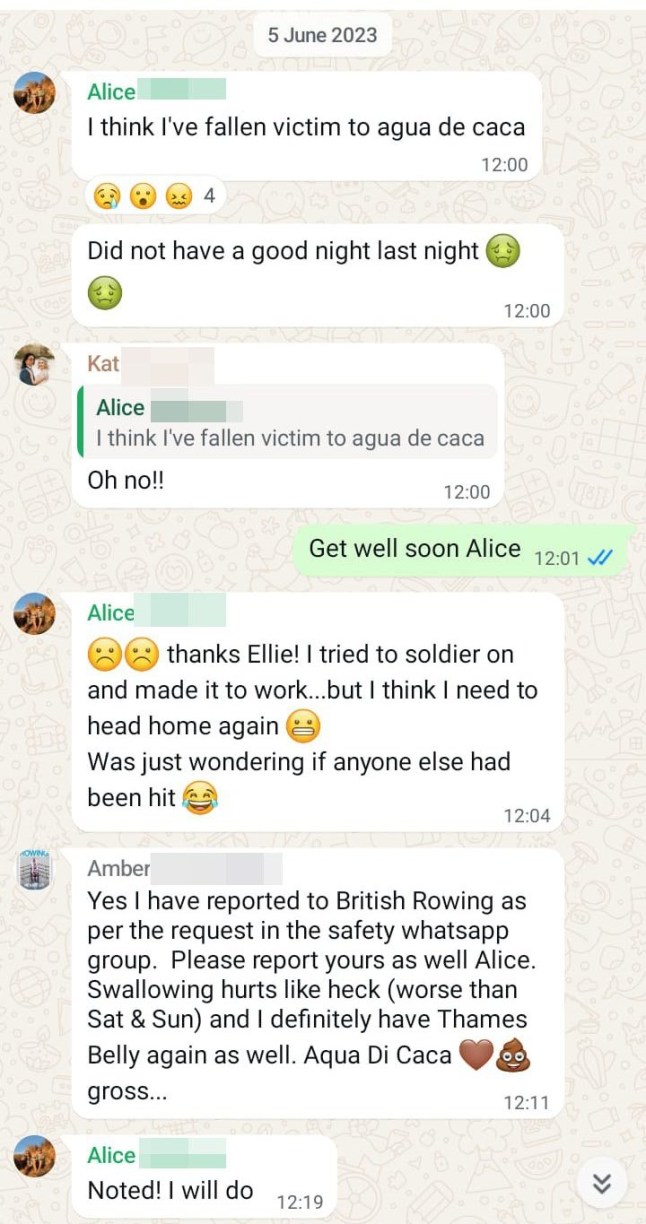 She shared Whatsapp messages from teammates in June 2023,after five of them became unwell at once with what they dubbed ‘Thames Belly’.