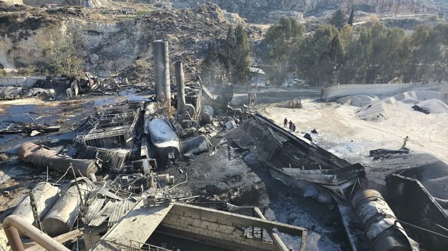 Firefighters and civil defence teams try to extinguish the fires following the Israeli attack targeting a factory in Ansar,in southern Lebanon on October 16,2025 (Picture: Getty)